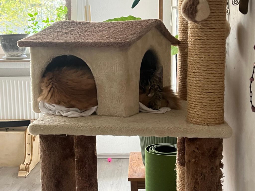 Kiko, das zarte Katzenmädchen, ist noch etwas schüchtern. Sie braucht Zeit, um Vertrauen zu fassen, und zieht sich gerne in ihr Versteck zurück. Wenn man sie bedrängt, kann sie auch mal fauchen – aber das ist nur ihre Art zu sagen: „Ich brauche noch ein bisschen Ruhe.“ Inzwischen traut sie sich abends schon heraus und spielt fröhlich mit Fratz.