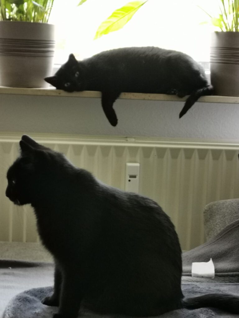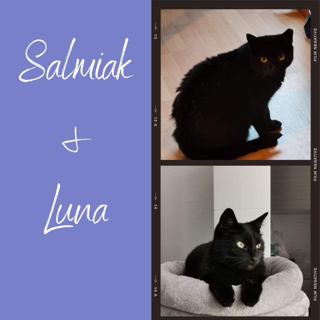 Salmiak (ca. 3 Jahre) und Luna (ca. 1,5 Jahre) sind zwei wunderschöne, schwarze Katzen, die zusammen durch dick und dünn gehen. Beide haben eine bewegte Vergangenheit: Sie lebten lange auf der Straße, bevor sie in die Obhut unseres Vereins kamen. Salmiak musste sogar ihre Kitten auf einem staubigen Dachboden inmitten von Glaswolle zur Welt bringen – eine tapfere Mama, die nun endlich selbst ein liebevolles Zuhause verdient. Luna wurde als junges Kätzchen eingefangen, nachdem die Futterstelle an der Luna und ihre Mutter fressen konnten, umziehen musste. Lunas Mutter konnte leider nicht mehr gesichert werden.
